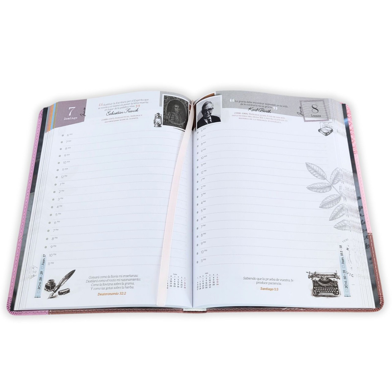 La Agenda Tesoros de Sabiduría 2026 en su delicado diseño de imitación piel color rosa combina elegancia, funcionalidad y devoción en una sola pieza. Cada día te sorprenderá con una frase inspiradora de un autor cristiano clásico, una breve biografía y un versículo bíblico que fortalecerán tu fe y te recordarán la fidelidad de Dios.