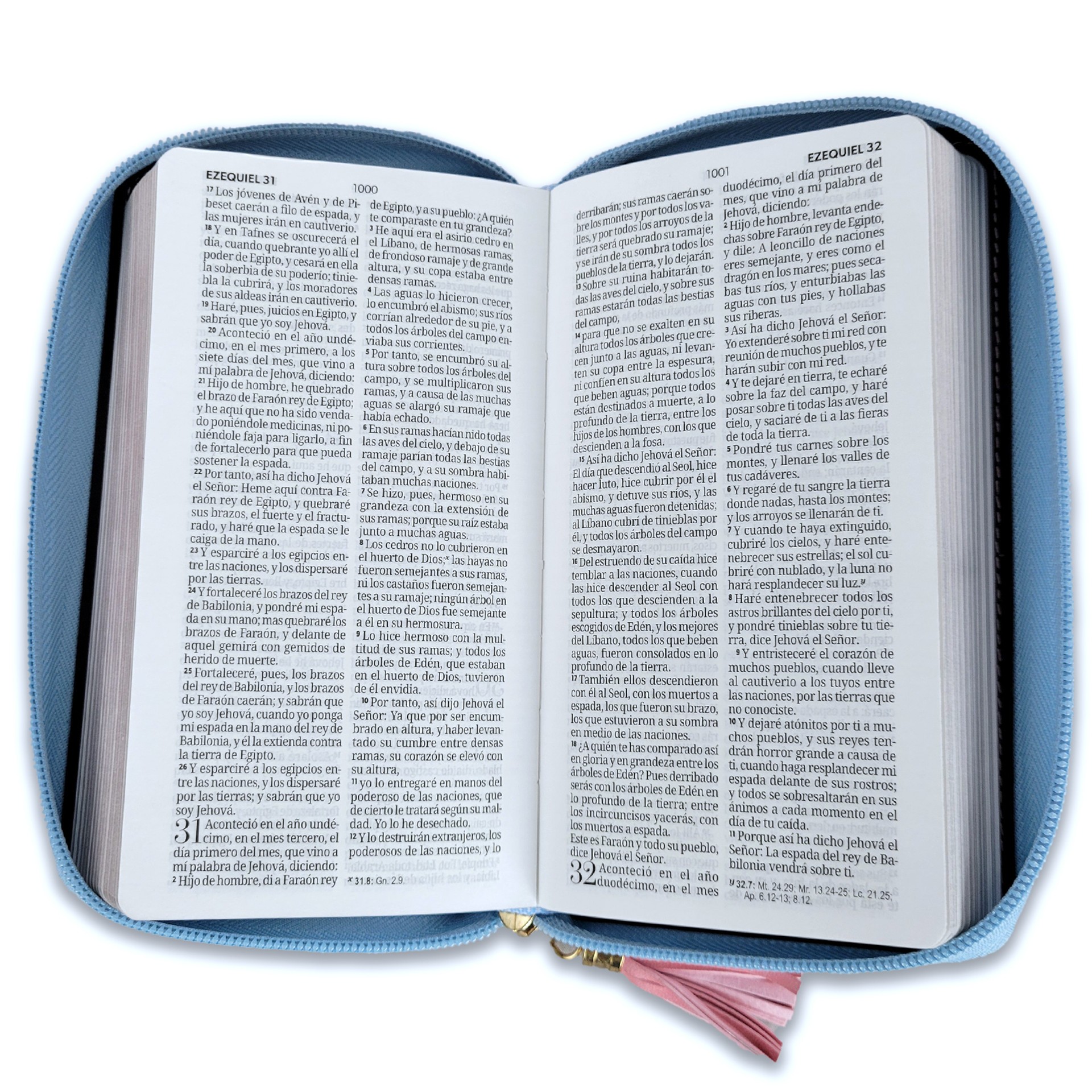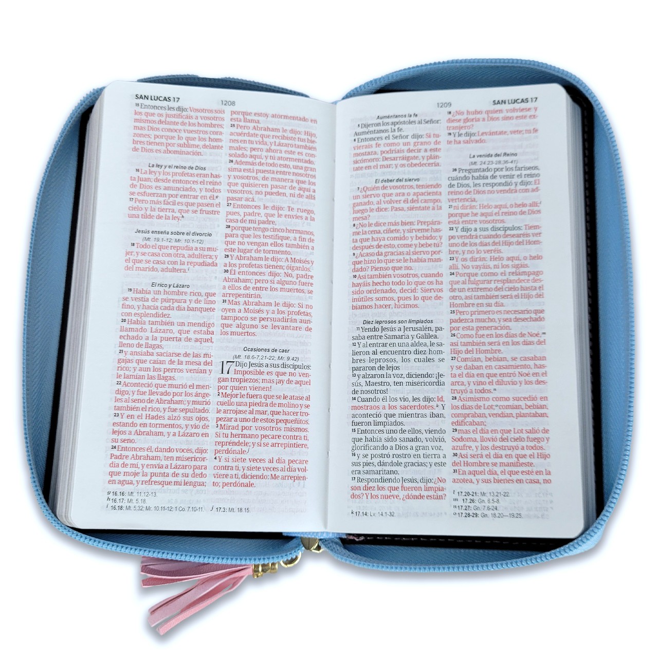 Su delicada cubierta en imitación piel rosa y azul le da un toque moderno y femenino, perfecta tanto para uso personal como para regalo. Basada en la clásica traducción Reina-Valera 1960, mantiene la pureza del texto bíblico con un formato práctico y refinado.