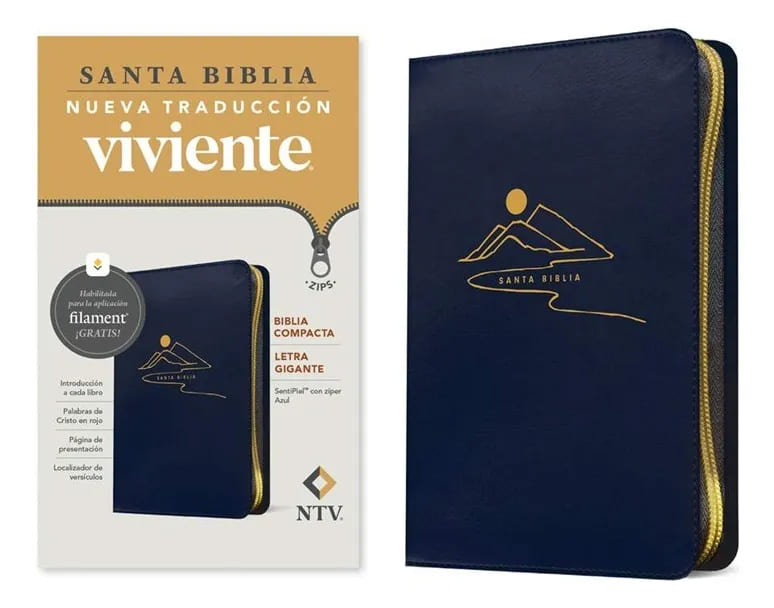La Biblia compacta NTV con letra gigante y cierre de zíper, en su hermosa edición SentiPiel color azul, es perfecta para quienes buscan una lectura clara, fácil de transportar y protegida para el uso diario.