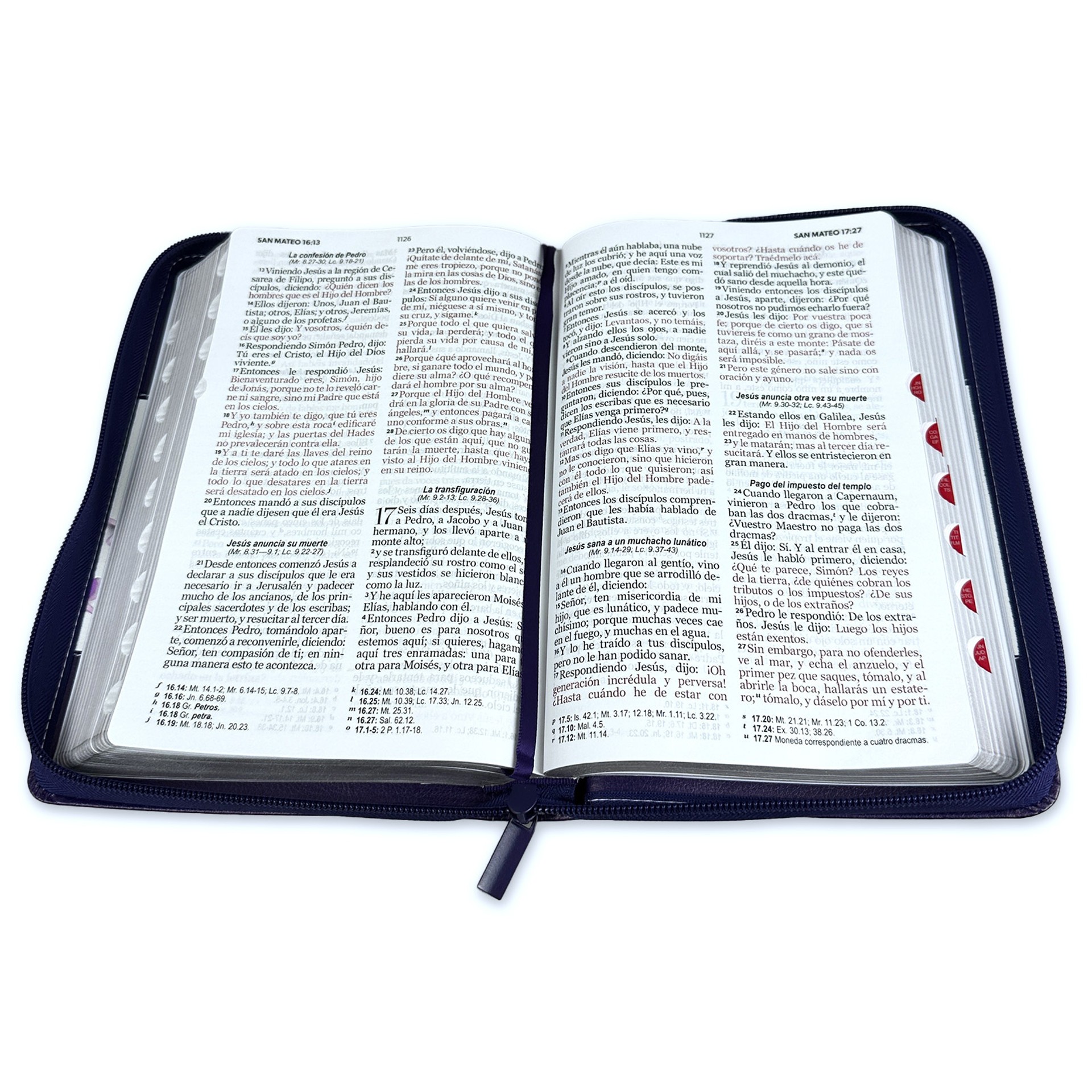La Biblia RVR1960 Letra Grande 12 pts. Lila y Flores con cierre e índice es una edición encantadora que une delicadeza, claridad y devoción. Su cubierta en imitación piel color lila con un diseño floral grabado refleja la belleza, la gracia y la vida que florece al meditar en la Palabra de Dios.