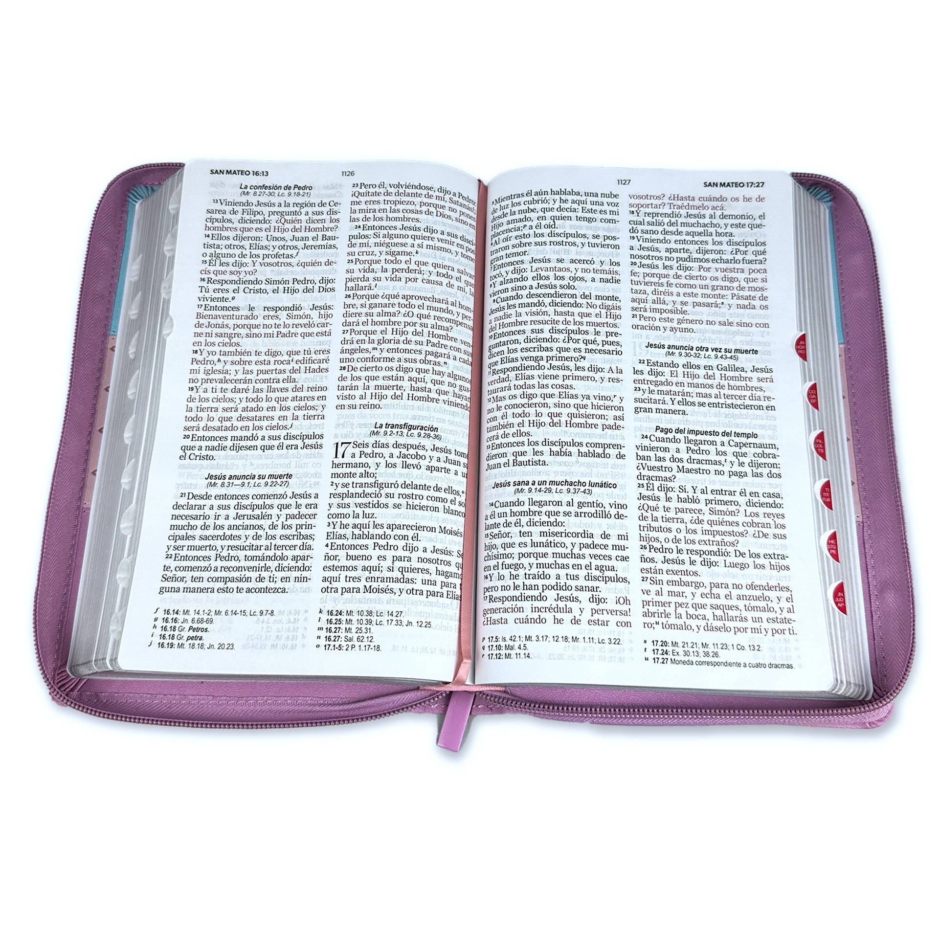 La Biblia RVR1960 Letra Grande 12 pts. Tricolor Azul/Rosa/Lila con cierre e índice es una edición moderna, delicada y funcional, creada para quienes buscan una Biblia práctica, hermosa y fácil de leer. Su cubierta en imitación piel tricolor combina tonos suaves y femeninos que inspiran paz, fe y esperanza en cada lectura.