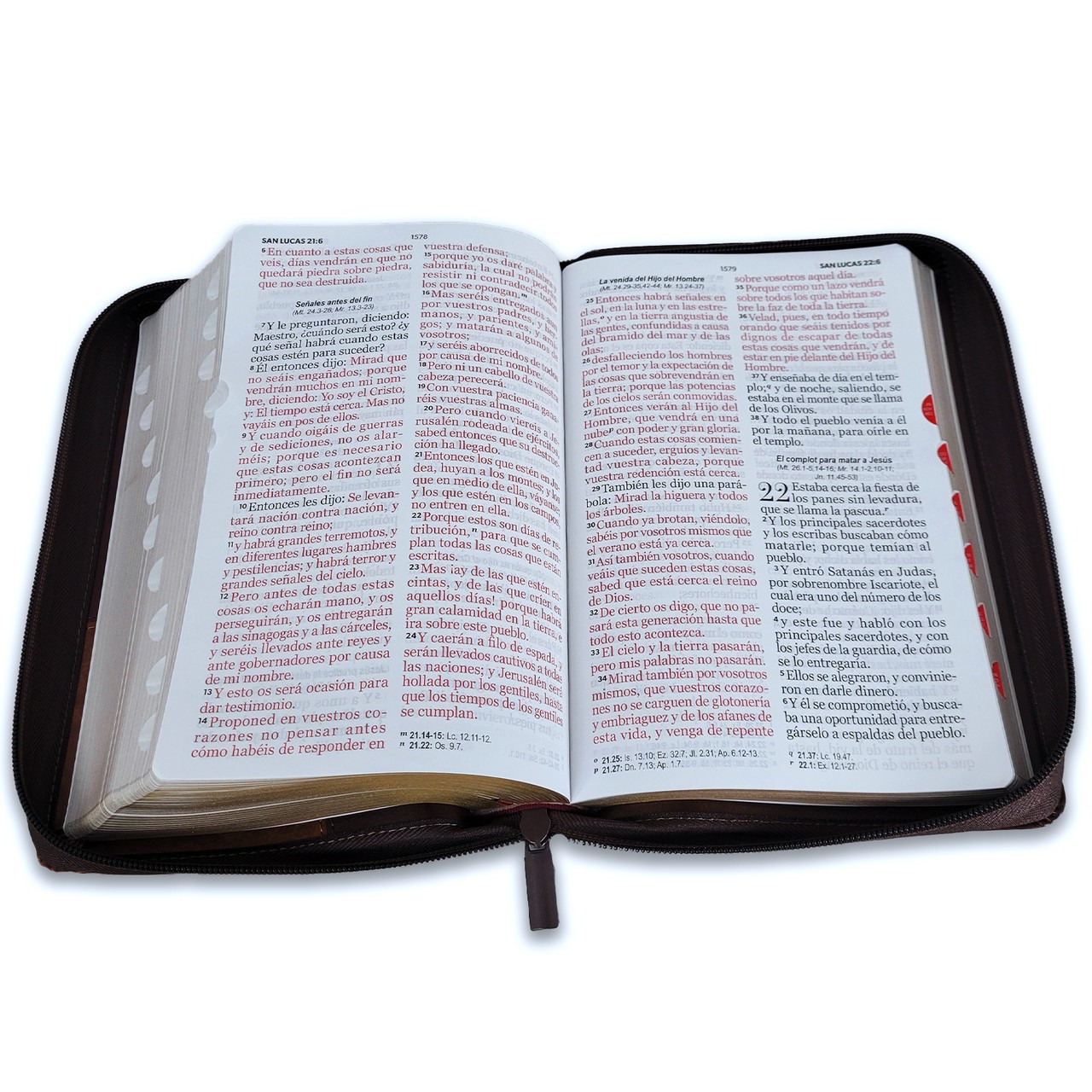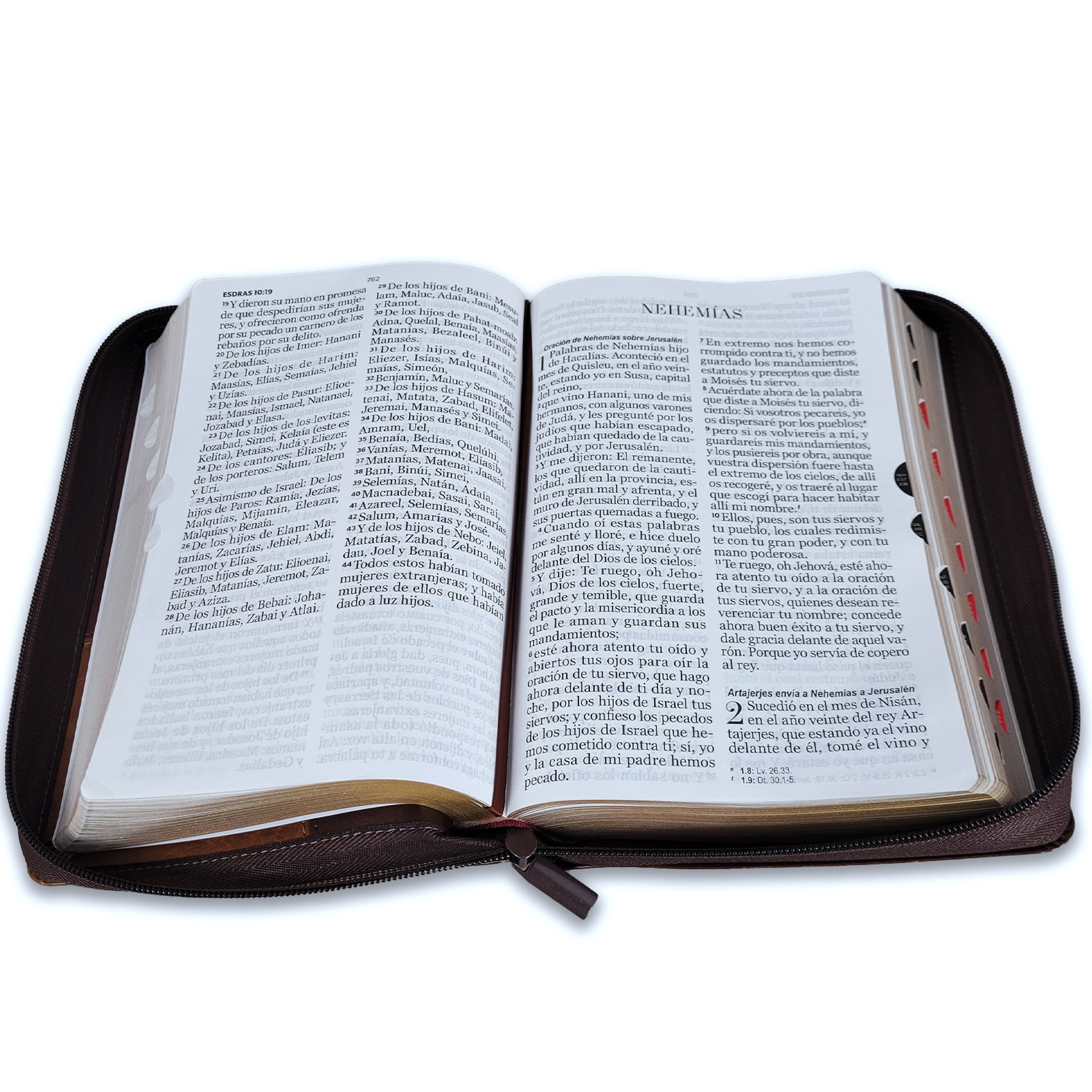 La Biblia RVR1960 Tamaño Manual, Letra Gigante Tricolor Café con cierre e índice combina elegancia, comodidad y profundidad espiritual en una sola edición. Su letra de 14 puntos, perfectamente legible, la convierte en una opción ideal para la lectura diaria, el estudio personal o el uso en la iglesia.