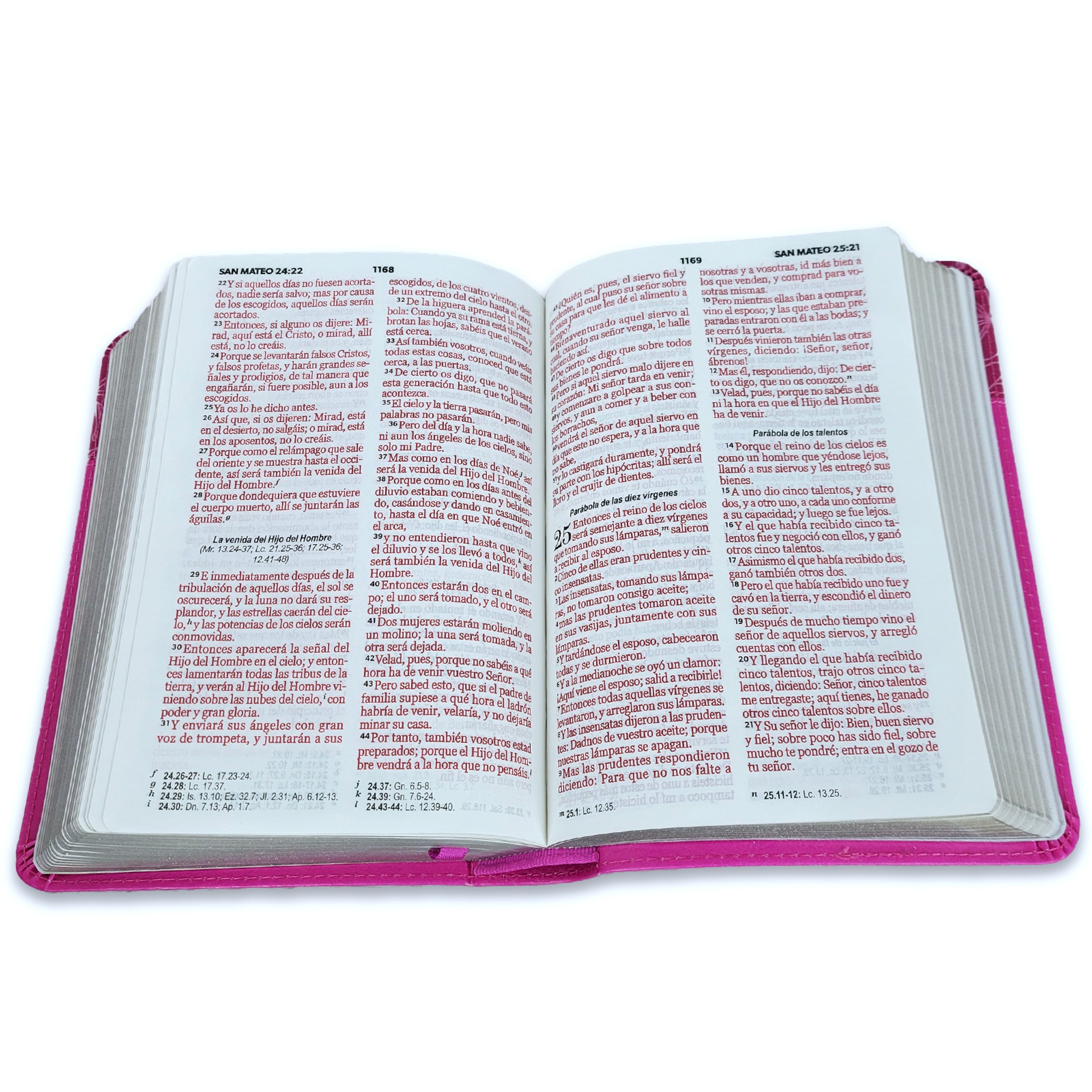 La Biblia RVR1960 Tamaño Portátil 10 pts. Rosa/Fucsia Flores es una edición hermosa, práctica y llena de inspiración. Su cubierta en imitación piel con delicado diseño floral en tonos rosa y fucsia refleja la belleza, la fe y la gracia que florecen al caminar con Dios.